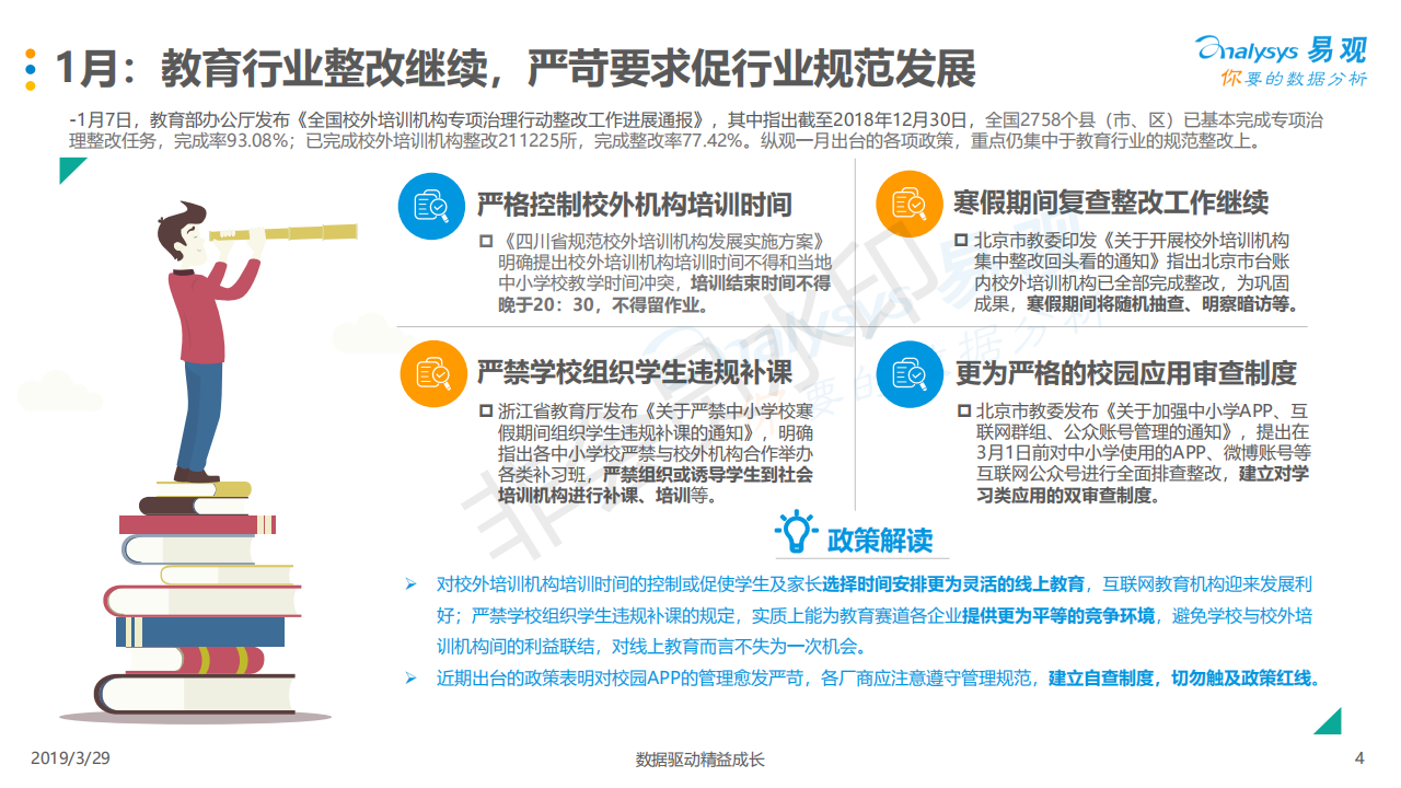 2019年3月29日,易觀發布了《互聯網教育行業政策風向解讀》分析報告。本分析主要是對教育相關政策進行分析解讀,包括Q1、“兩會”教育相關政策內容、提案等多個方面。