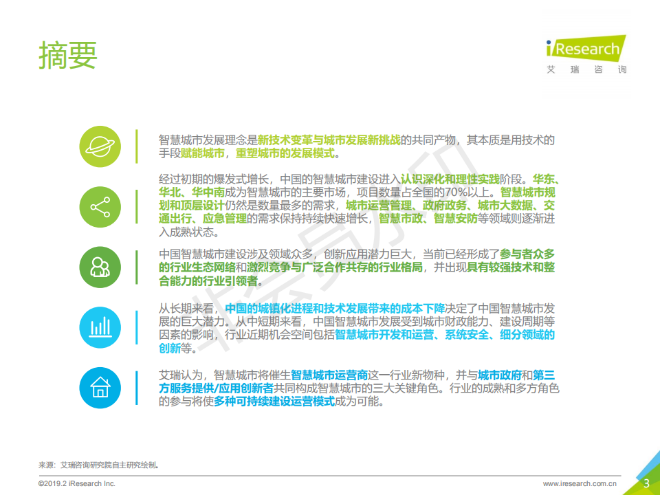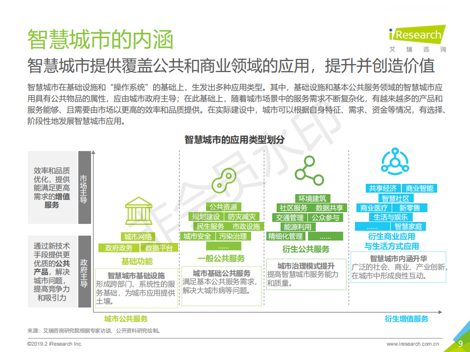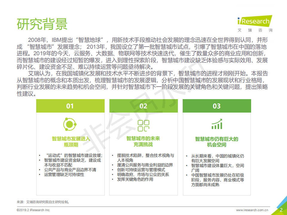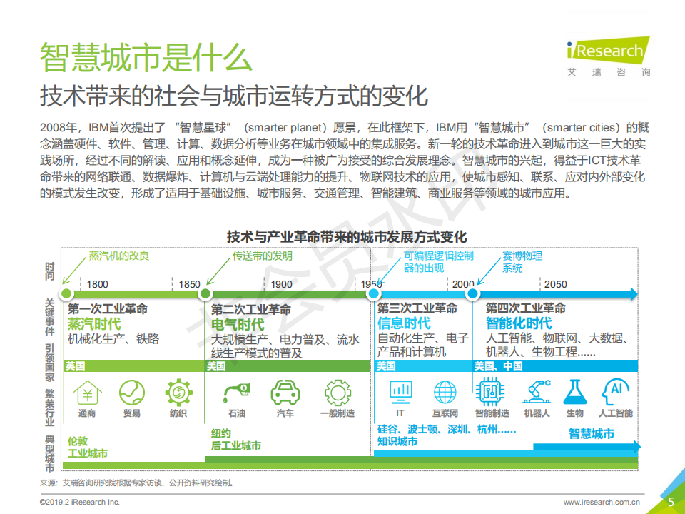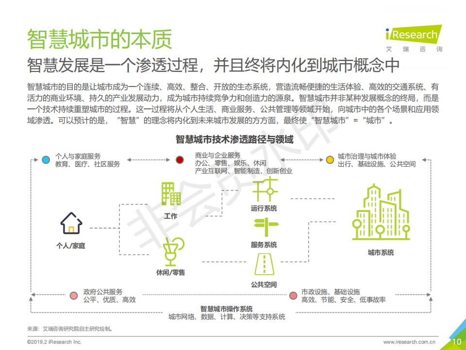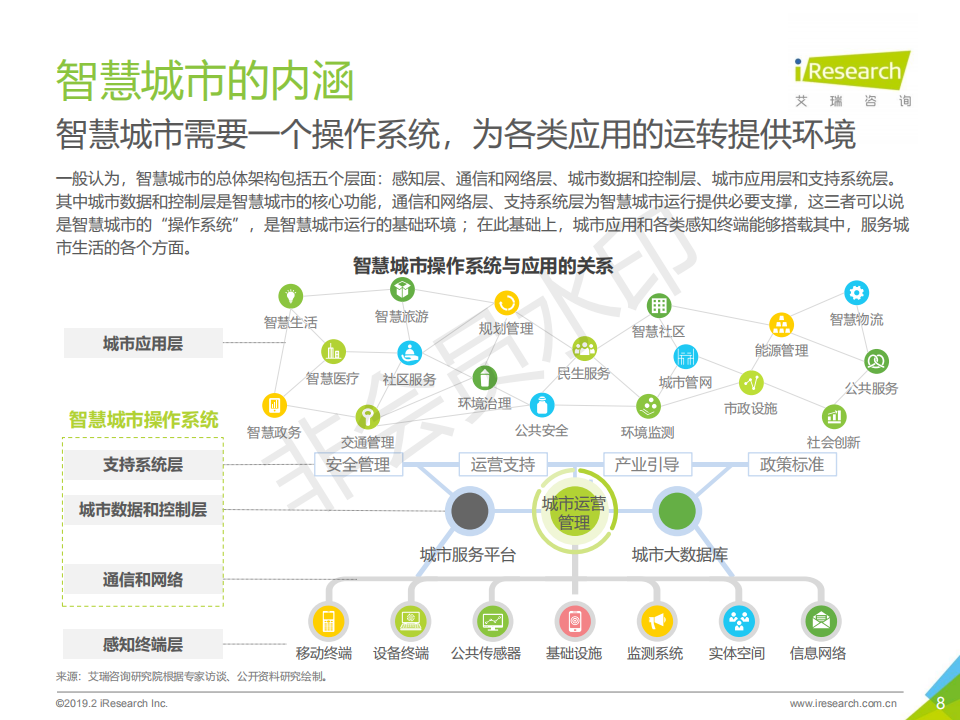 2008年,IBM提出“智慧地球”概念,在此之上衍生的“智慧城市”發展理念迅速在全世界得到認同和發展; 2013年,我國設立了第一批智慧城市試點,引爆了智慧城市在中國的落地建設。2019年的今天,中國成為世界上智慧城市數量最多的國家,云服務、大數據、物聯網等技術快速迭代,催生了數量眾多的商業應用和創新。而智慧城市的建設經過短暫的爆發,進入到挑戰與機會共存的持續探索階段。艾瑞認為,在我國城鎮化發展和技術水平不斷進步的背景下,智慧城市的進程才剛剛開始。本報告將從智慧城市的概念和本質出發,梳理智慧城市的發展邏輯,分析中國智慧城市的發展現狀和行業格局,判斷行業發展的未來趨勢和機會空間,針對智慧城市下一階段發展的關鍵角色和關鍵問題,提出操作性建議。
