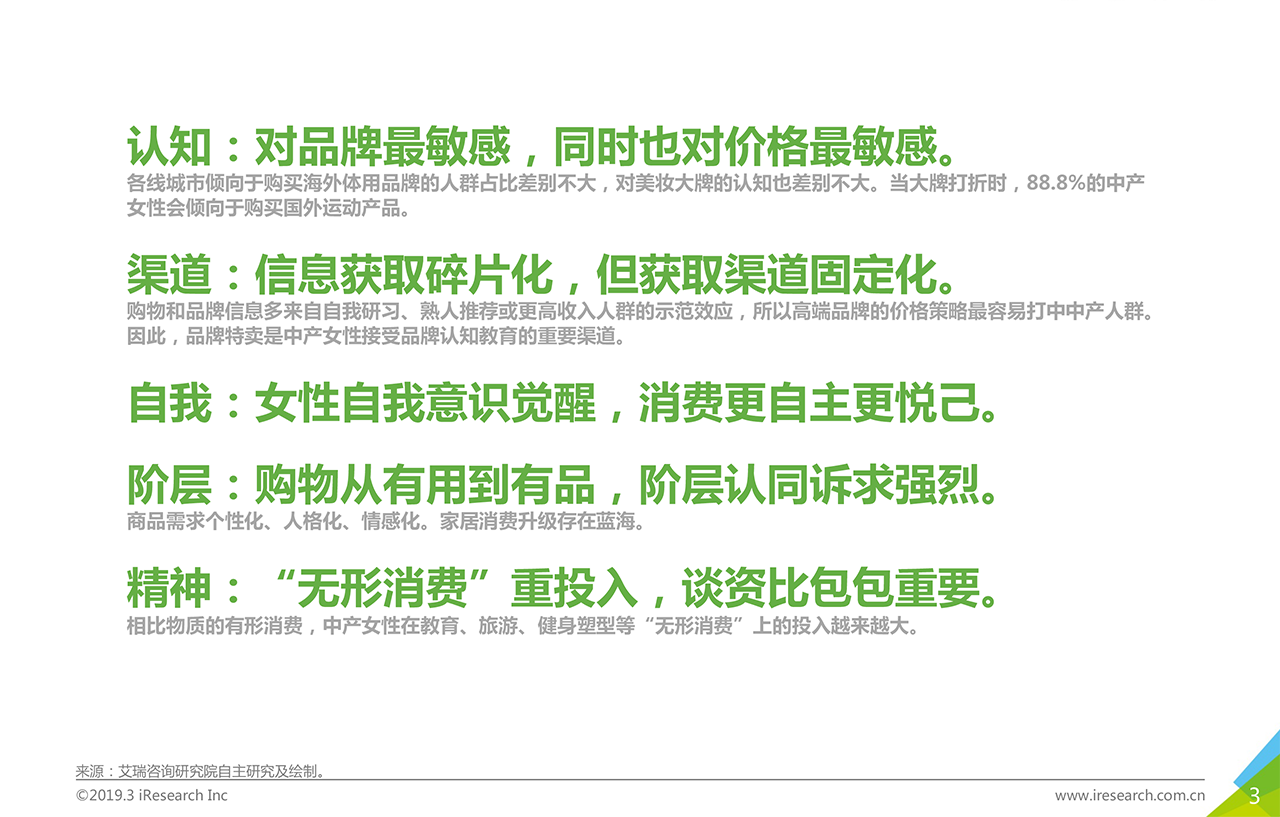 報告下載《2019年中國中產女性消費報告》深入分析了中國中產女性的消費傾向、消費行為等數據,并借助一二線中產女性和小城中產女性的相關數據對比,分析整體中國中產女性的消費趨勢,希望此份報告能夠為市場各方對中國中產女性消費的深入了解提供參考。
