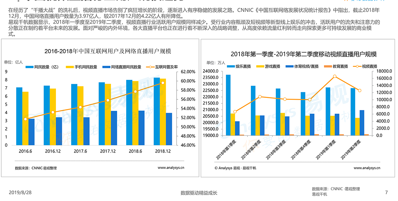 報(bào)告下載2019年8月28日,易觀發(fā)布了《2019年中國(guó)娛樂(lè)直播市場(chǎng)年度綜合分析》的分析報(bào)告。隨著中國(guó)人民人均收入水平的不斷提高,大眾消費(fèi)能力也在持續(xù)攀升。國(guó)家統(tǒng)計(jì)局公布數(shù)據(jù)顯示,2018年全國(guó)人民人均可支配收入為28,228.3元人民幣,人均消費(fèi)支出已達(dá)19,853元人民幣。在物質(zhì)財(cái)富豐盈的基礎(chǔ)上,國(guó)民日漸提升的精神需求也助推著文化娛樂(lè)產(chǎn)業(yè)的繁榮發(fā)展。2018年,全國(guó)人民教育文化娛樂(lè)消費(fèi)支出達(dá)到2,226元人民幣,占人均可消費(fèi)支付的11.2%。文化消費(fèi)市場(chǎng)快速擴(kuò)張,不僅催生了行業(yè)孕育出更多新業(yè)態(tài)與消費(fèi)模式,同時(shí),也推動(dòng)傳統(tǒng)產(chǎn)業(yè)走向全面升級(jí)。 網(wǎng)絡(luò)直播與多個(gè)產(chǎn)業(yè)的跨界融合日益成熟,直播+正在為影視、電商、教育、企業(yè)服務(wù)等行業(yè)打開(kāi)新的想象空間。