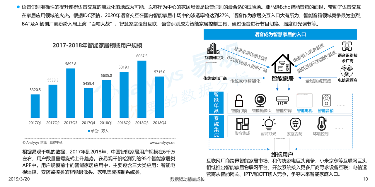 報告下載2019年3月20日,易觀發(fā)布了《智能家居市場專題分析2019》的分析報告。人民日益增長的物質(zhì)文化需求激發(fā)人們改變傳統(tǒng),以期獲得更方便、舒適、快捷、安全和健康的家居生活。智能家居入口及平臺已被巨頭掌握,智能家居產(chǎn)品種類繁雜,細(xì)分垂直市場同樣潛力巨大。在高頻使用的智能家居應(yīng)用中,“視覺”控制、“語音”控制和“觸覺”控制是用戶最習(xí)慣性方式。